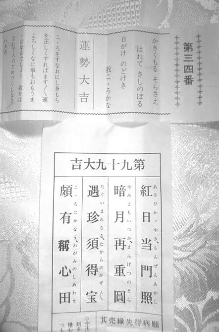 しかも、どこの神社仏閣にもある定番おみくじ(箱から棒を引くやつ)は、第九十九番大吉でした。百で大吉だったら縁起良かったかな~(九十九の番号が目に入った時は一瞬やな予感したんだけど、大吉で良かった…)