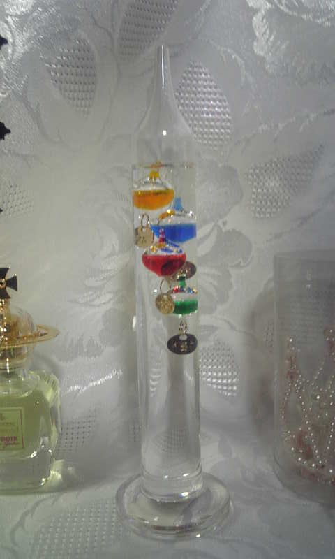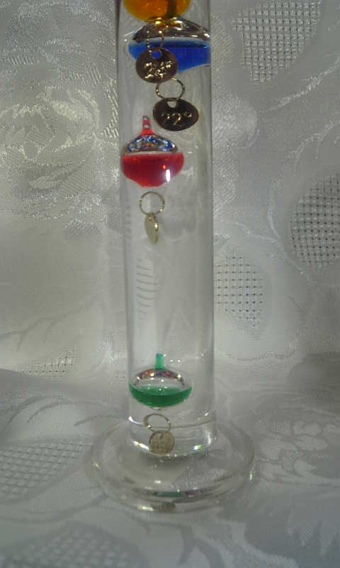 で、自分用にガリレオ温度計なるものを購入。温度が上がると筒の中の温度の表示されてる球体が下がるというもの。一番下・緑の球体は18度。